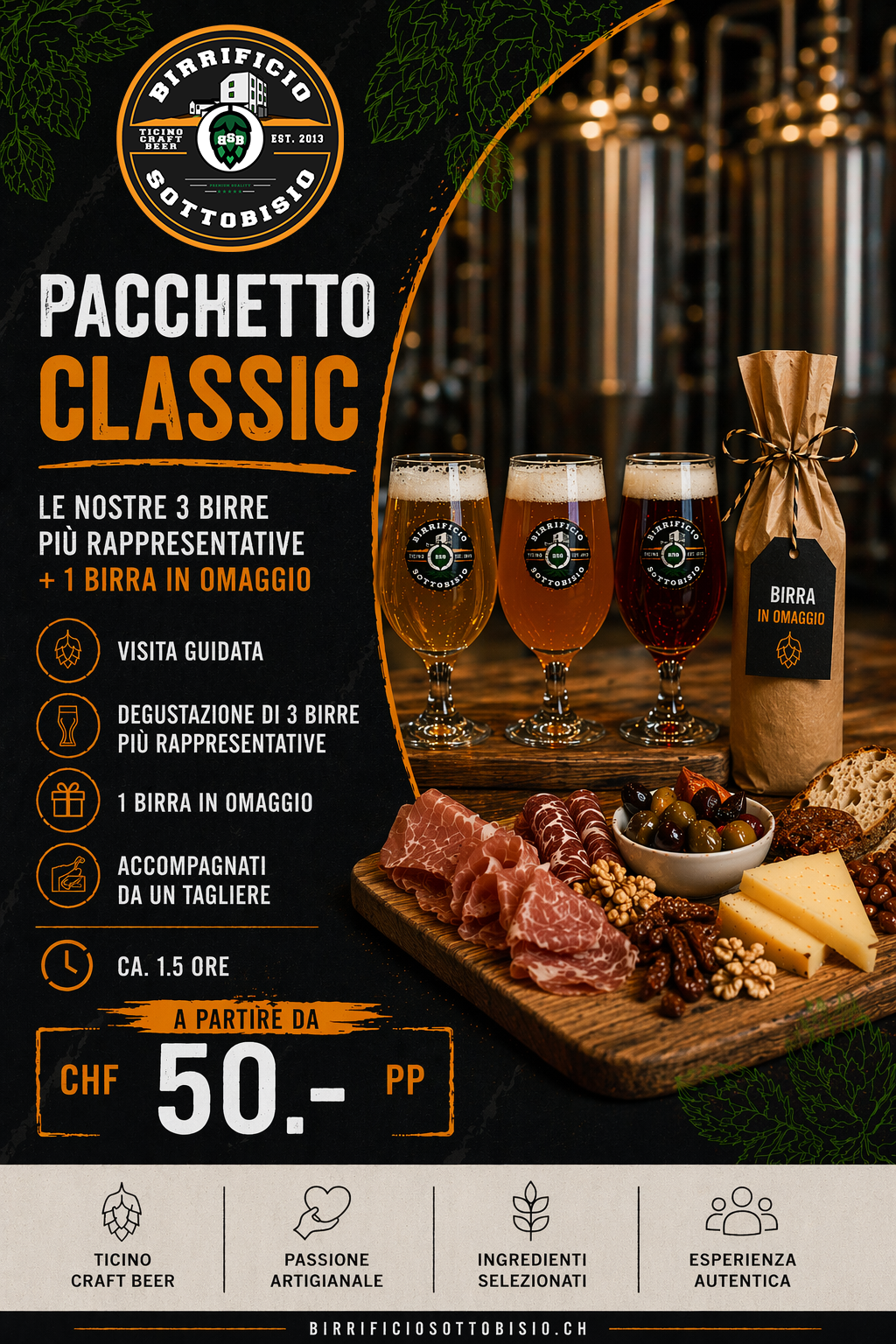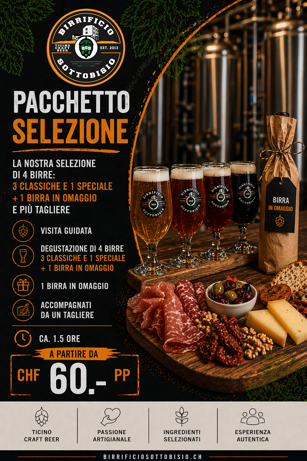 Percorso completo: visita guidata, degustazione di 4 birre (3 classiche + 1 speciale), tagliere e 1 birra in omaggio.